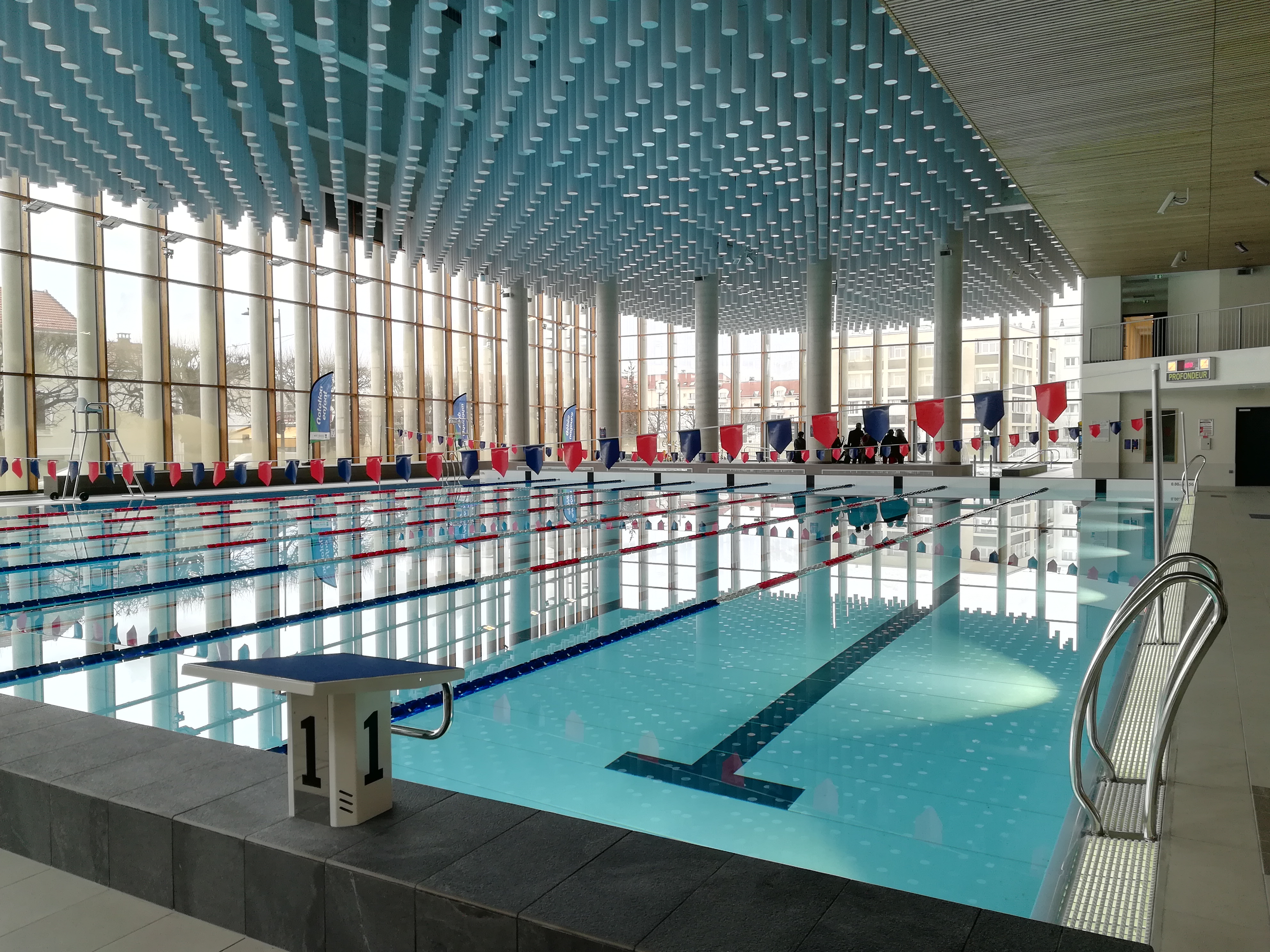 L'équipement est neuf, clair, très agréable par temps ensoleillé. Les vestiaires sont spacieux (un bémol sur les casiers, dont le système est trop souvent défaillant). Il semble aussi qu'un système permette de limiter le bruit, alors que les piscines résonnent souvent beaucoup. Contrairement à certains commentaires, je n'ai rencontré aucun problème avec le personnel, qu'il s'agisse de l'accueil ou des maîtres-nageurs. Le bassin sportif est bien, mais impraticable à certains horaires. Entre les activités de type aquagym et l'accueil des clubs, il arrive plus d'une fois que seules deux lignes d'eau soient libres - dont une avec 1m20 de profondeur, ce qui fait que certains marchent dans la ligne, la rendant impraticable au risque d'une collision. Nager à 9 personnes de niveau différent dans une longueur de 25m est tout simplement impossible. Il faut du coup se rabattre sur des créneaux peu demandés.