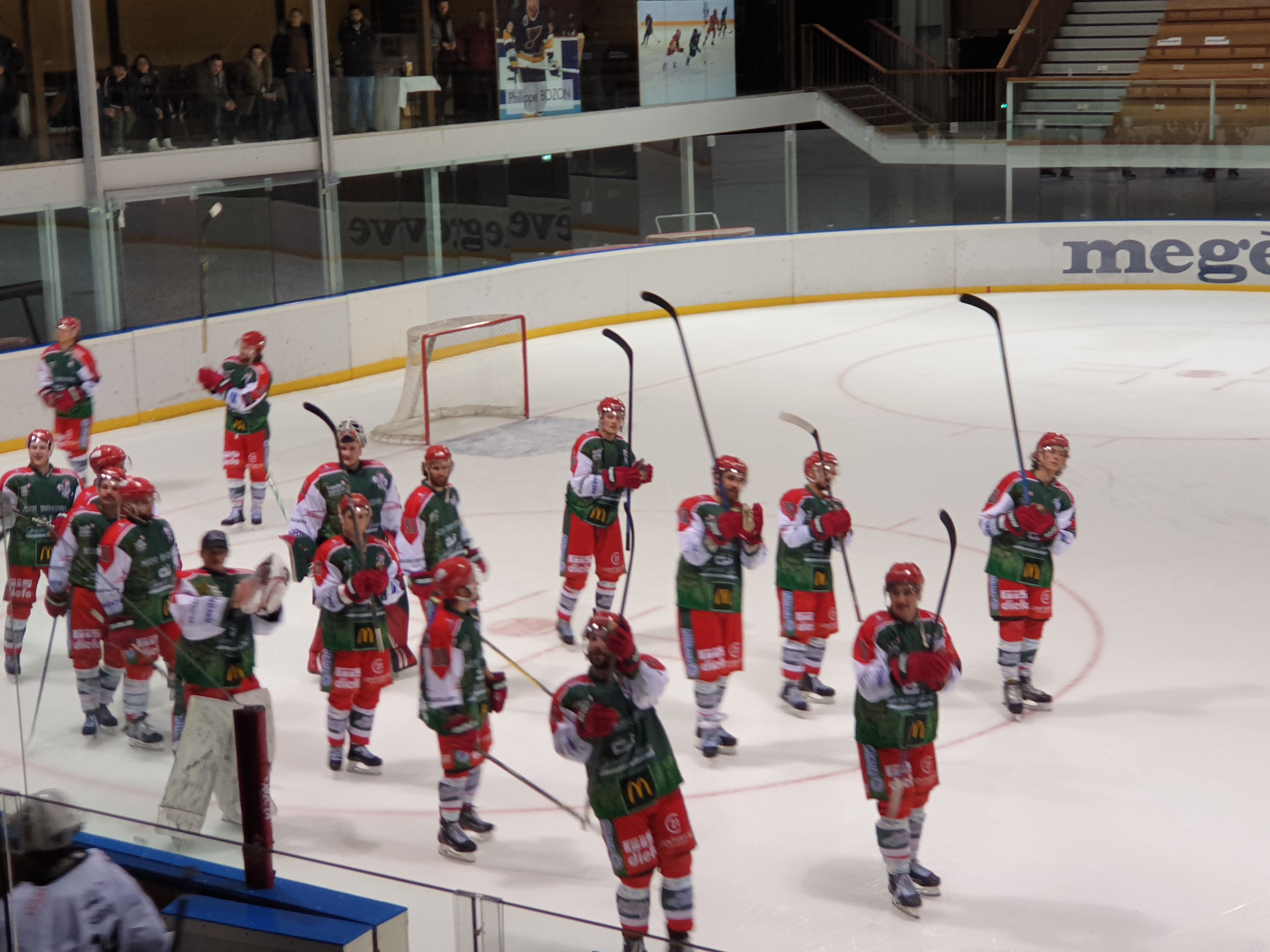 Nous sommes allés voir la qualification de Megève au dépend de Brest en hockey sur glace. Une excellente soirée avec des fans endiablés